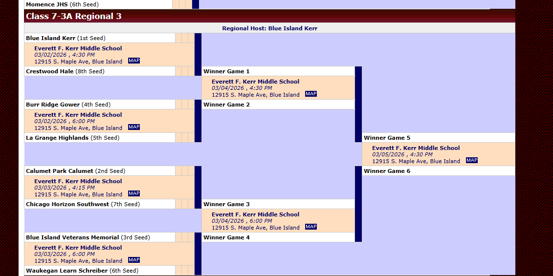 Congratulations to Everett F. Kerr Middle School on advancing to the next round of the IESA 7th Grade Girls Volleyball Regional Championship Tournament! The team will face Burr Ridge Gower in the s...