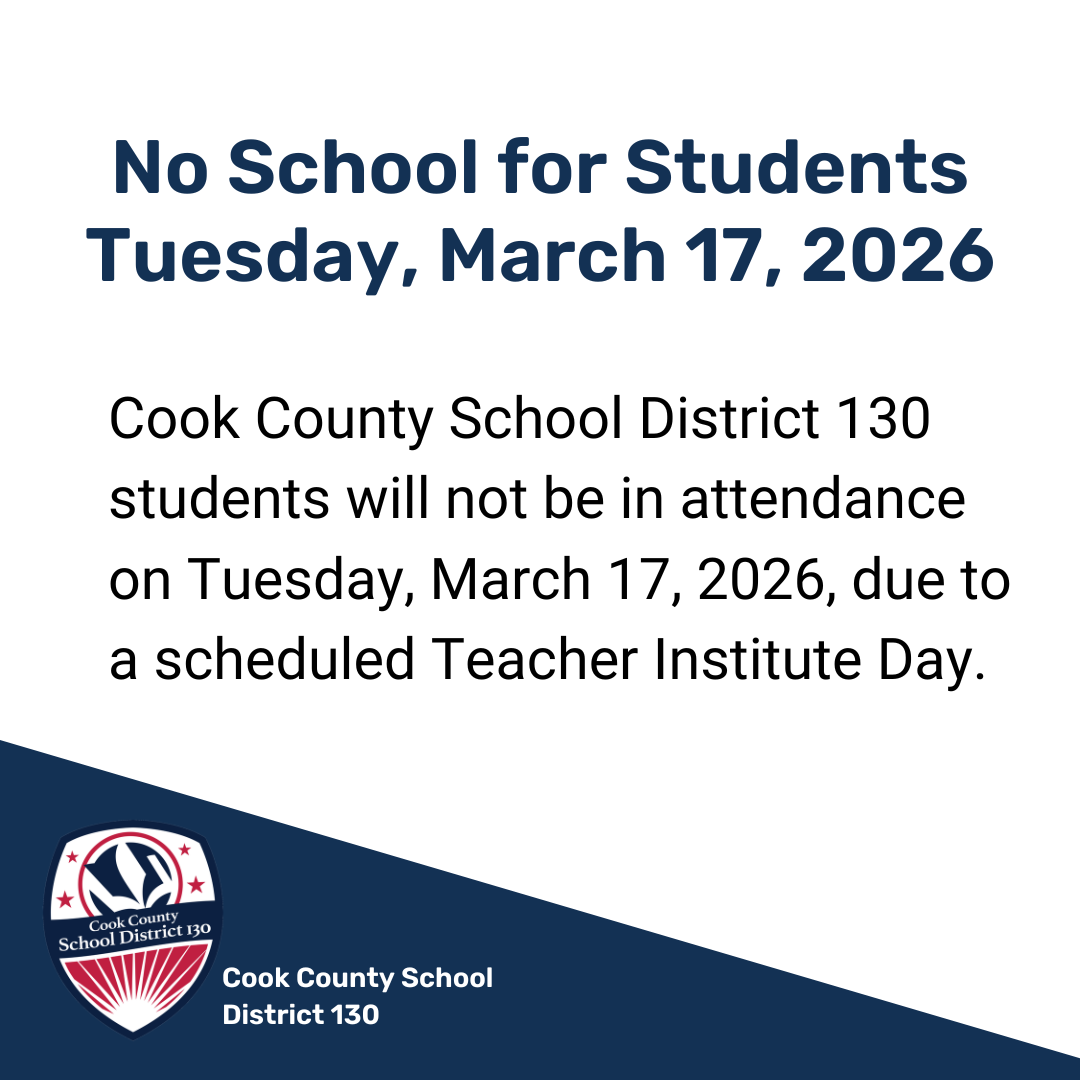 Cook County School District 130 students will not be in attendance on Tuesday, March 17, 2026, due to a scheduled Teacher Institute Day.#WeAre130Attend Today. Achieve Tomorrow. Every Student, Every...